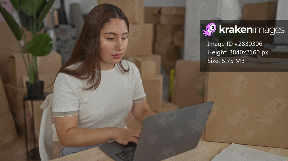 Woman typing on laptop in building filled with moving boxes and a potted plant on table as she sets up workspace; focus.