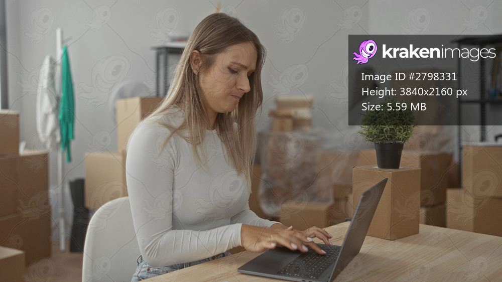 Woman typing on laptop in new home surrounded by cardboard boxes and houseplants, representing the process of moving and settling in new environment