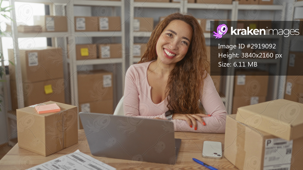 Woman typing on laptop with parcel and stacked cardboard boxes in building office; small business confidence.