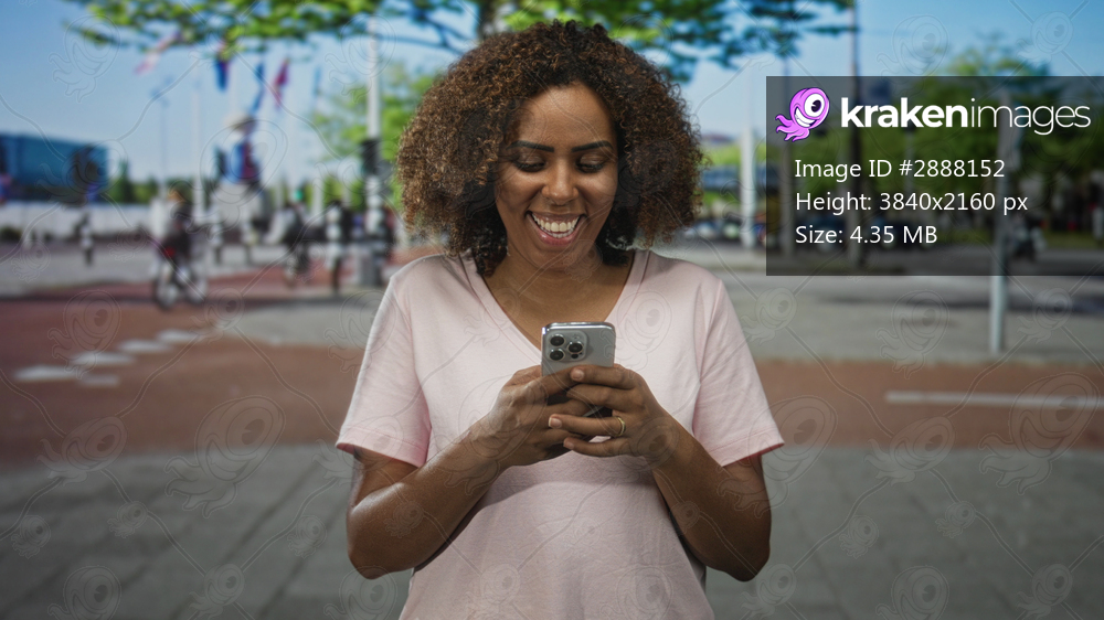 Woman typing on smartphone with visible hands on street, smiling at screen; social connection joy everyday.