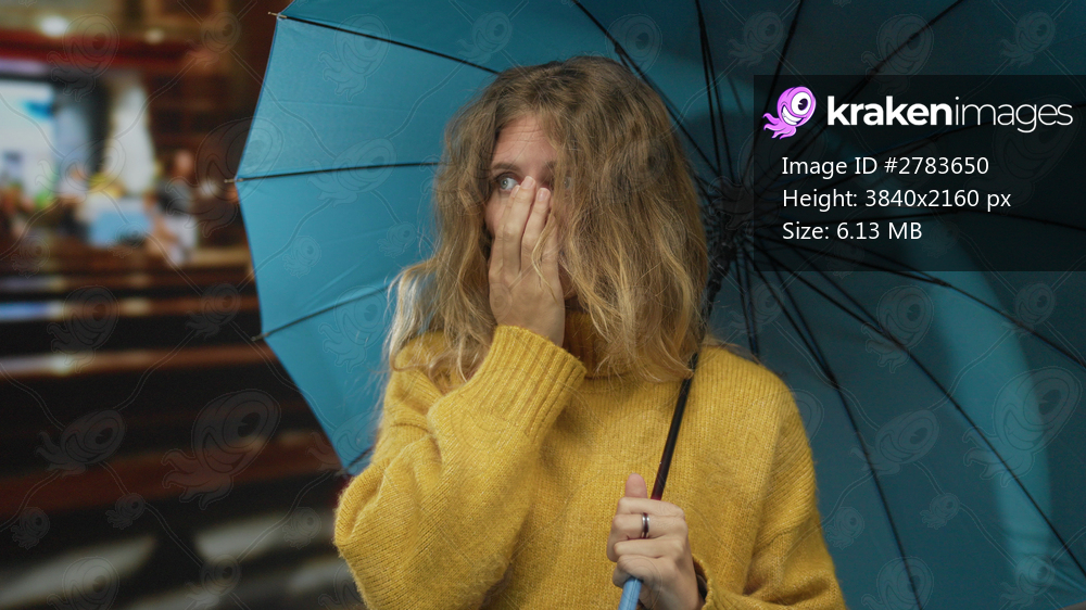 Woman umbrella covering church blonde anxious sweater blue interior young visitor gazes downward in reflective solitude.
