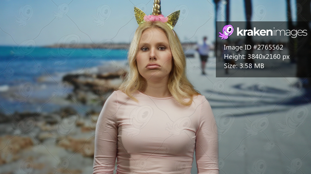 Woman with unicorn diadem stands on beach promenade, looking nervous and worried, surrounded by beachgoers and the blue ocean.