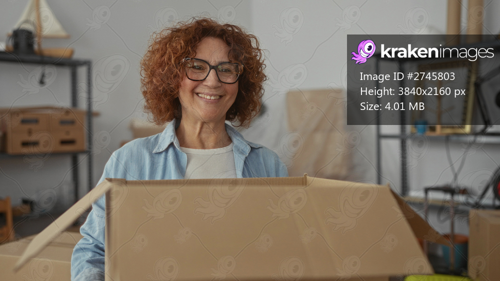 Woman unpacking boxes in a new home living room, surrounded by cardboard, expressing happiness and excitement, highlighting hispanic ethnicity and brunette hair in a domestic setting. - Kraken Images