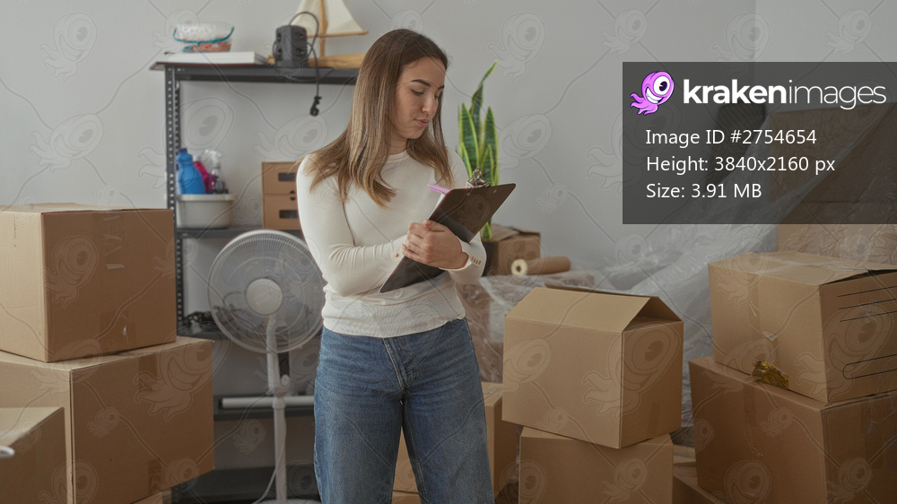 Woman unpacking boxes in new home while taking notes on clipboard, surrounded by cardboard, plant, fan, and shelf, depicting a busy moving day scene in an indoor setting. - Kraken Images