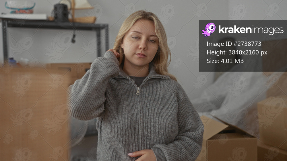 Woman unpacking in new home, blonde and young, inside an empty room surrounded by moving boxes, suggesting a recent move and transition into living space, feeling contemplative. - Kraken Images