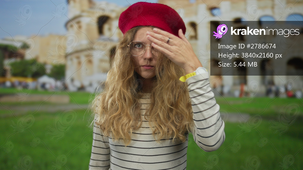 Woman uses hand covering eyes in italy, as blonde young beret and glasses style highlights colosseum backdrop with a striped shirt.