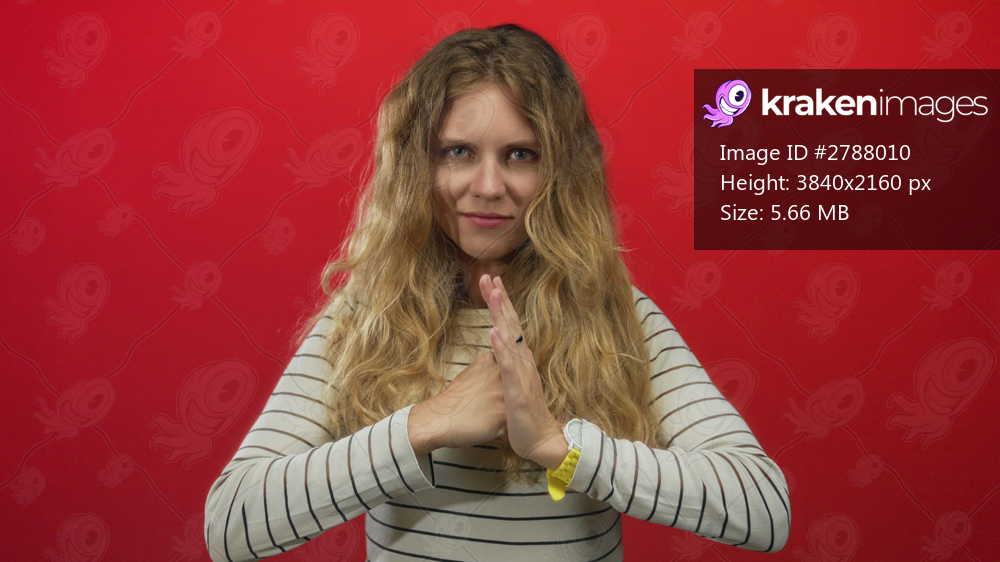 Woman uses hands for boxing in studio where her blonde hair contrasts with a red wall and she wears a striped shirt as she punch and block with a smirk. - Kraken Images