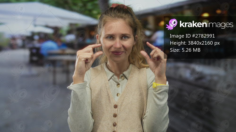 Woman uses hands measuring width in cafe while blonde young patron holds fingers in gesture and appears smiling outdoors.