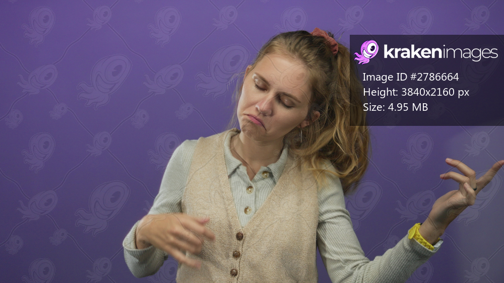 Woman uses hands strumming air guitar in studio, showcasing blonde young performer against purple wall highlighting hair, earrings and vest.