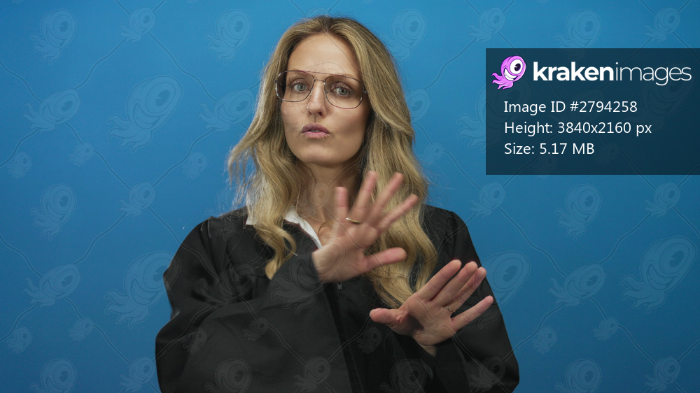 Woman uses hands while speaking in a studio to a young blonde judge wearing a uniform against a blue background.