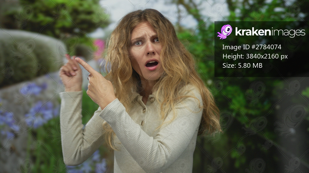 Woman uses her fingers for pointing in a garden with a blonde young figure displaying surprised confusion with hand gesture.