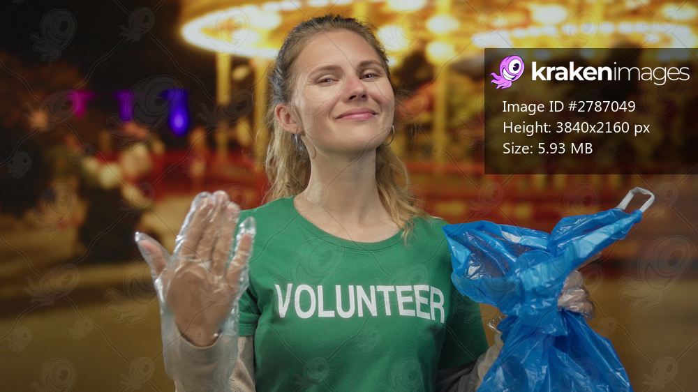 Woman uses her hand to express a smile during a fairground event as a blonde young volunteer wearing glove holds a bag at night.