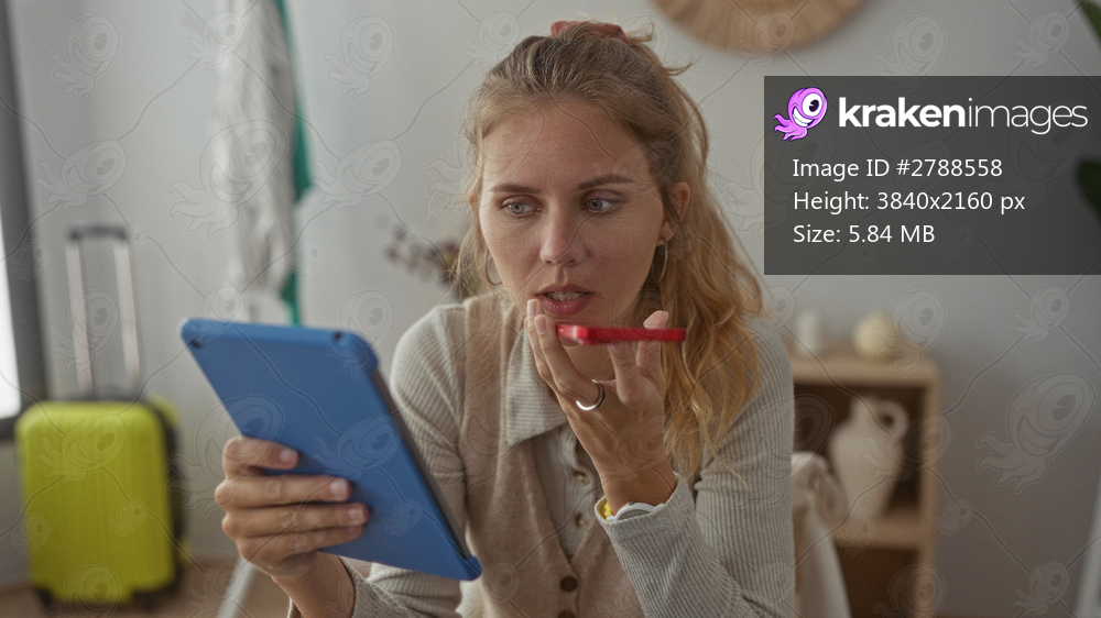 Woman uses smartphone speaking in livingroom with blonde hair and young expression while holding tablet reading next to vase on suitcase.