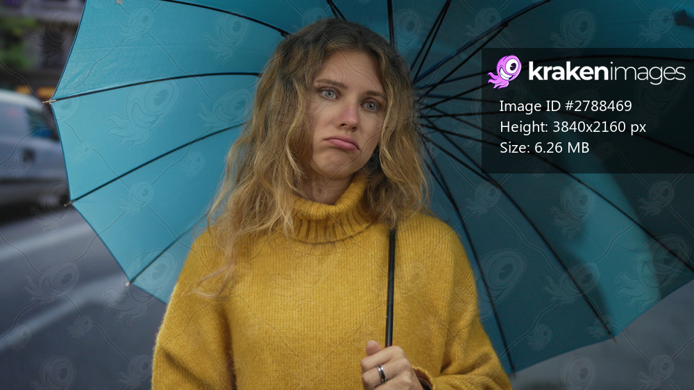 Woman uses umbrella feeling sad in city watching a blonde young passerby on street in urban rainy atmosphere beneath a blue canopy.