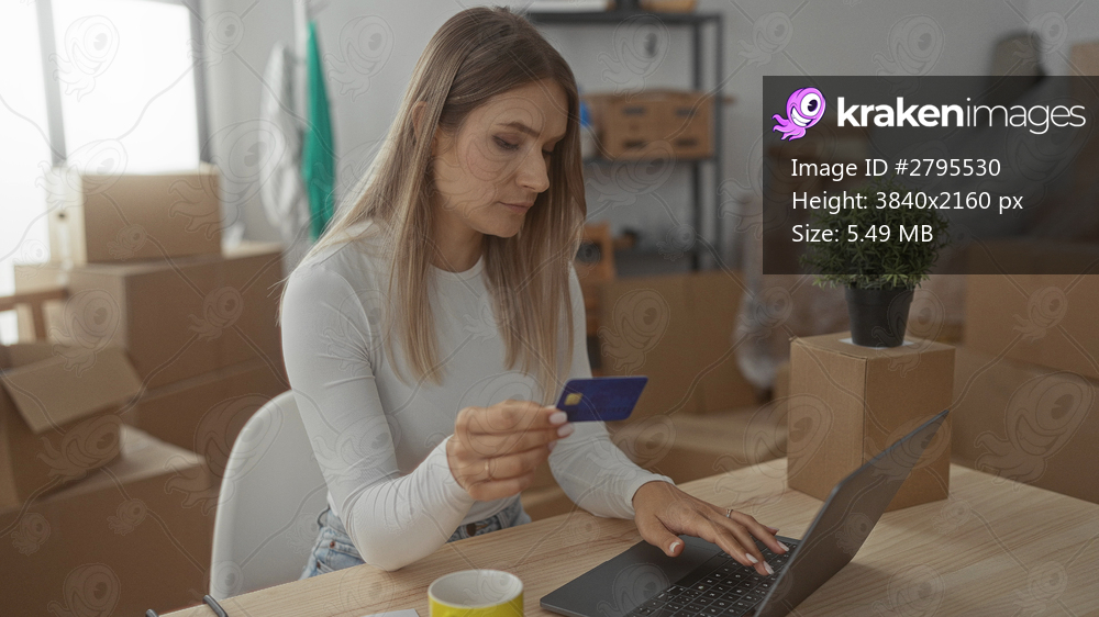 Woman using credit card on laptop in new home surrounded by cardboard boxes with a plant on the table, capturing a moment of online shopping or banking in a fresh setting. - Kraken Images