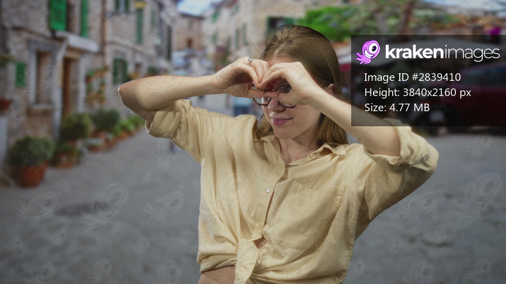 Woman using hand binoculars gesture with eyeglasses on street; curiosity exploration travel wanderlust.
