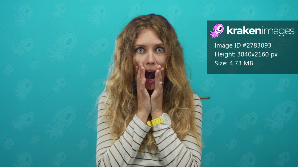 Woman using hands revealing surprise in studio portrait of blonde young person against blue background covering face with stunned expression.