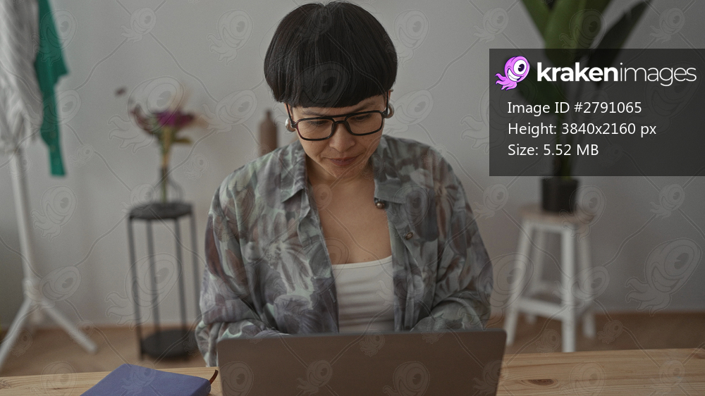 Woman using laptop in cozy living room with plant and elegant decor suggests a serene working environment in apartment setting.