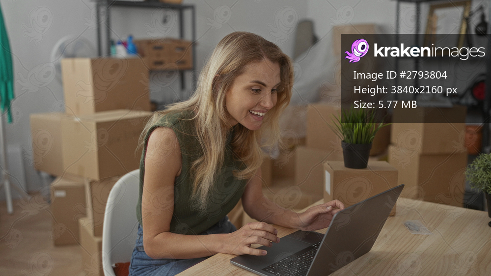Woman using laptop in new home surrounded by boxes in living room, showcasing a youthful, blonde, caucasian woman working indoors in a recently moved apartment setting. - Kraken Images