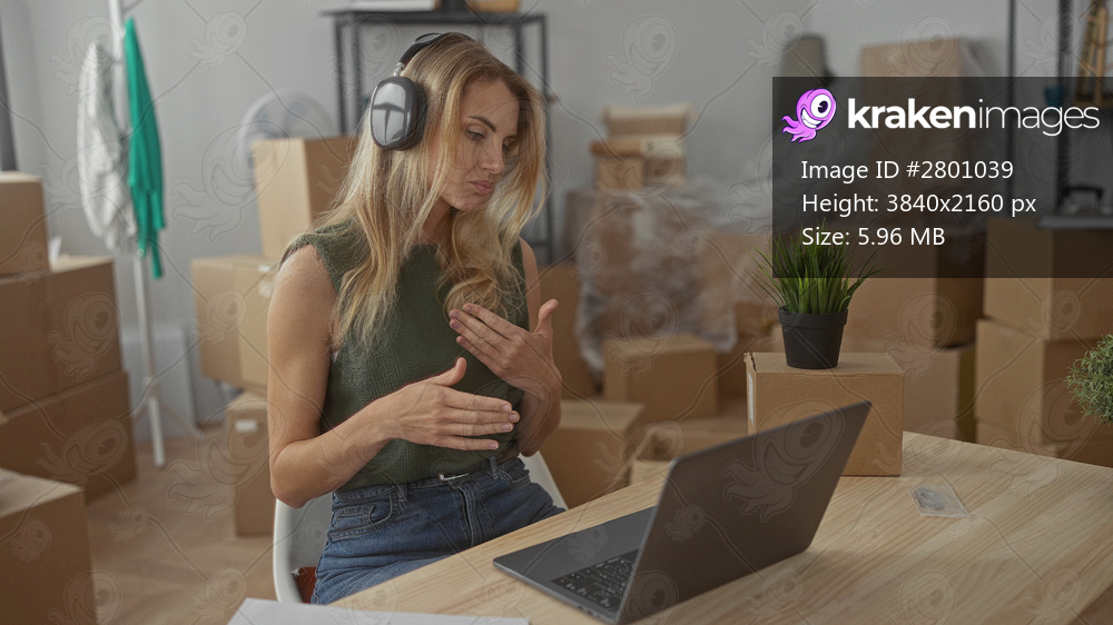 Woman using laptop in new home surrounded by boxes in living room wearing headphones and casual clothes giving virtual presentation while sitting at desk with plant. - Kraken Images