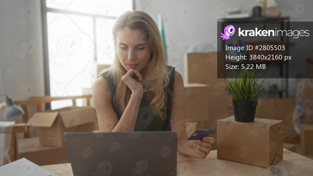 Woman using laptop in new home surrounded by cardboard boxes holding credit card expressing modern lifestyle and online shopping in bright living room setting. - Kraken Images