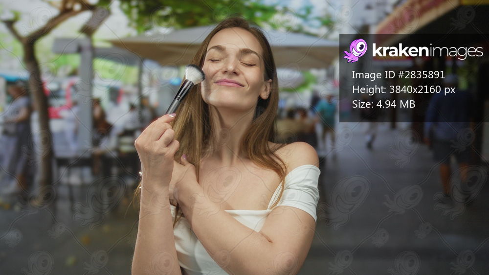 Woman using makeupbrush to brush cheek on sunny late afternoon outdoor restaurant terrace; beauty confidence.