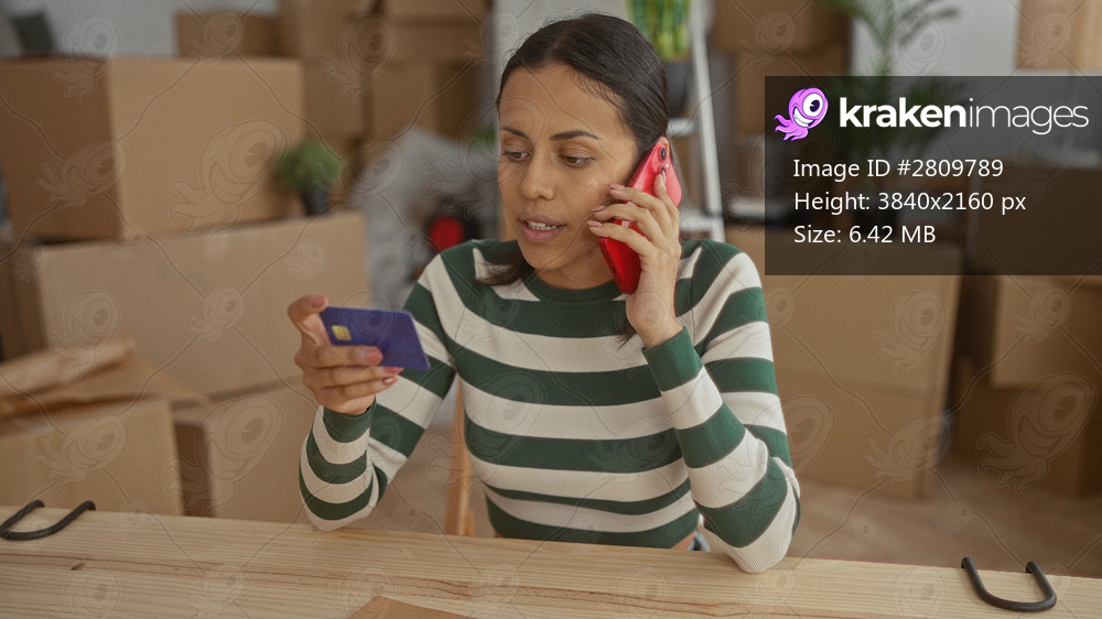 Woman using phone and credit card indoors surrounded by moving boxes suggests recent relocation to a new home or apartment interior while communicating and multitasking. - Kraken Images