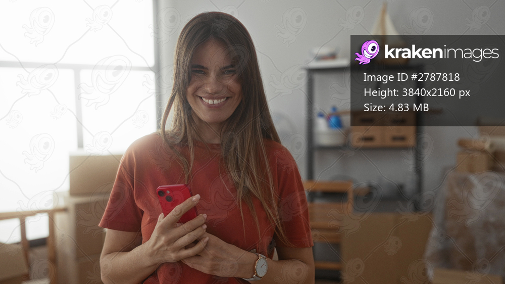 Woman using phone smiling in new home surrounded by moving boxes in bright living room showcasing a modern lifestyle
