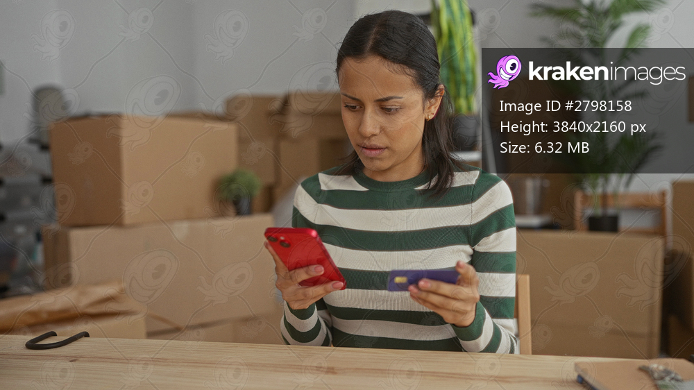 Woman using smartphone and credit card sitting indoors surrounded by moving boxes in her new apartment showcasing online shopping and home relocation process. - Kraken Images