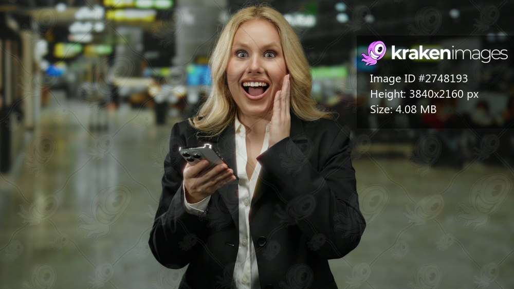 Woman using smartphone with excitement at airport terminal, surrounded by bustling travelers, dressed in black suit, capturing business travel, technology, and connectivity. - Kraken Images