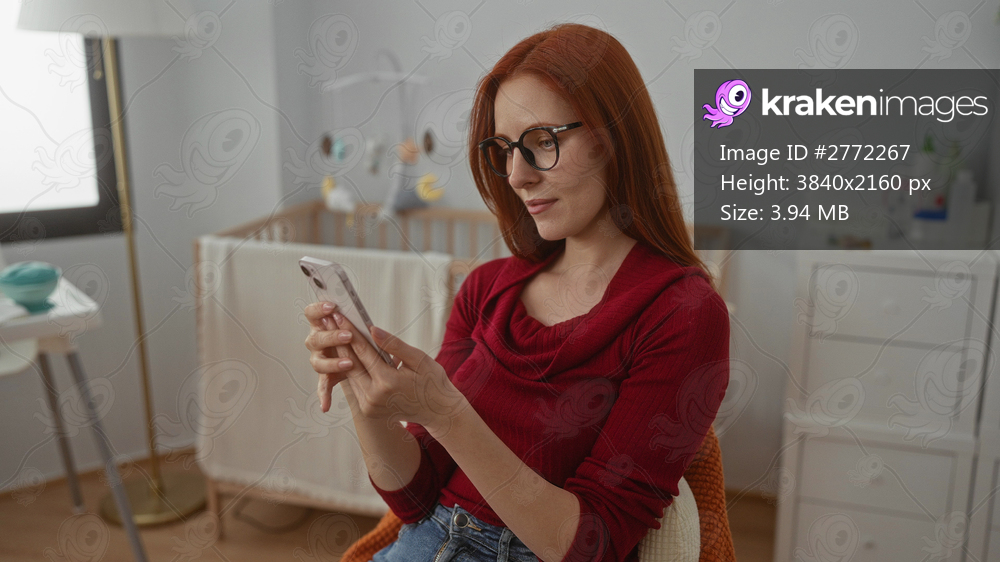 Woman using smartphone in bedroom sitting near baby crib, redhead wearing glasses and red sweater, modern home interior, peaceful atmosphere.