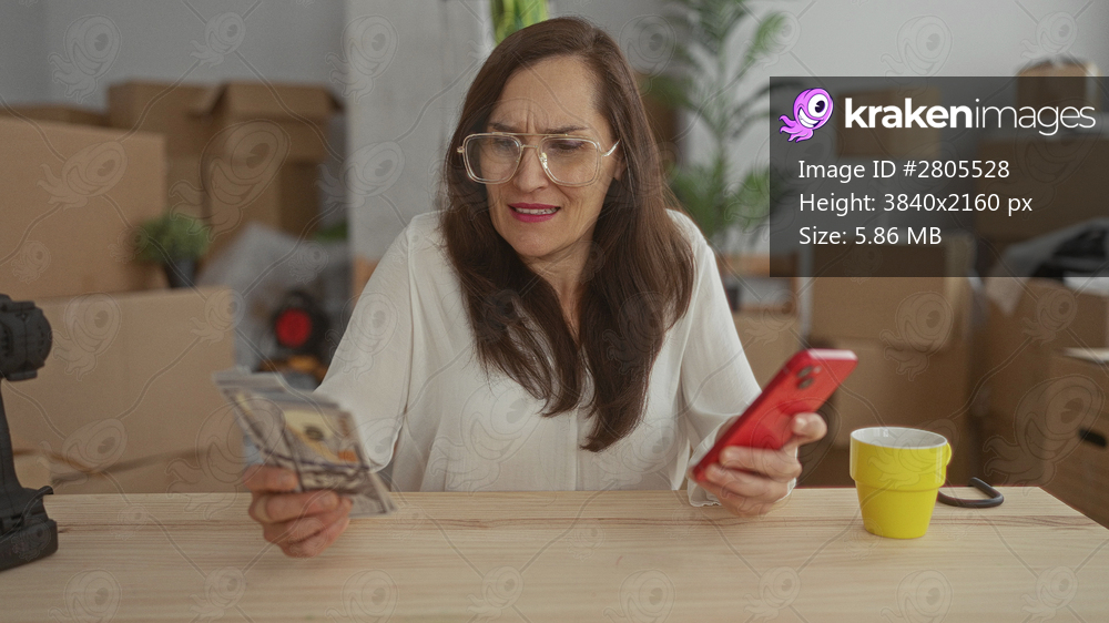 Woman using smartphone in new home surrounded by unpacked boxes holding us dollars, showing satisfaction in an indoor room environment.