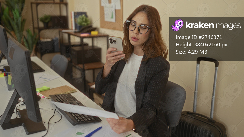 Woman using smartphone in office checks documents at desk in professional workspace with plants and luggage, emphasizing busy work environment and modern business attire. - Kraken Images