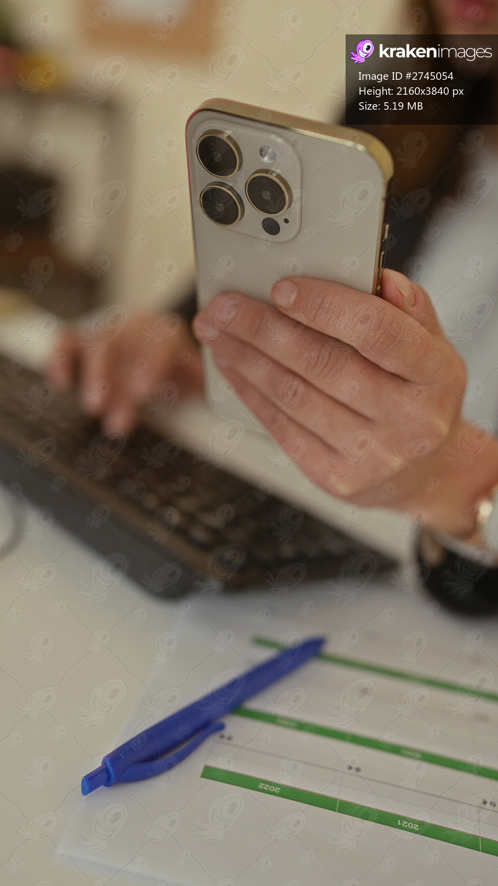 Woman using smartphone in office setting with keyboard calendar blue pen on desk in interior workspace showing hands phone technology indoors business modern - Kraken Images