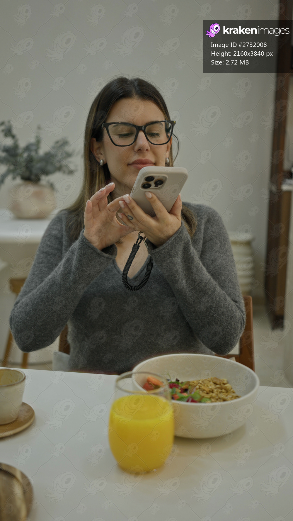 Woman using smartphone indoors at luxury restaurant with modern decor, glass of juice, bowl of cereal, and stylish ambiance, capturing a casual dining moment. - Kraken Images