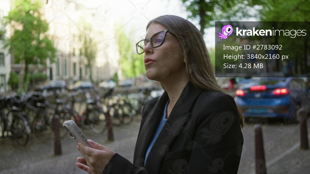 Woman using smartphone near amsterdam canals wearing glasses focusing on phone surrounded by bicycles in outdoor urban setting with vibrant green trees and parked cars - Kraken Images