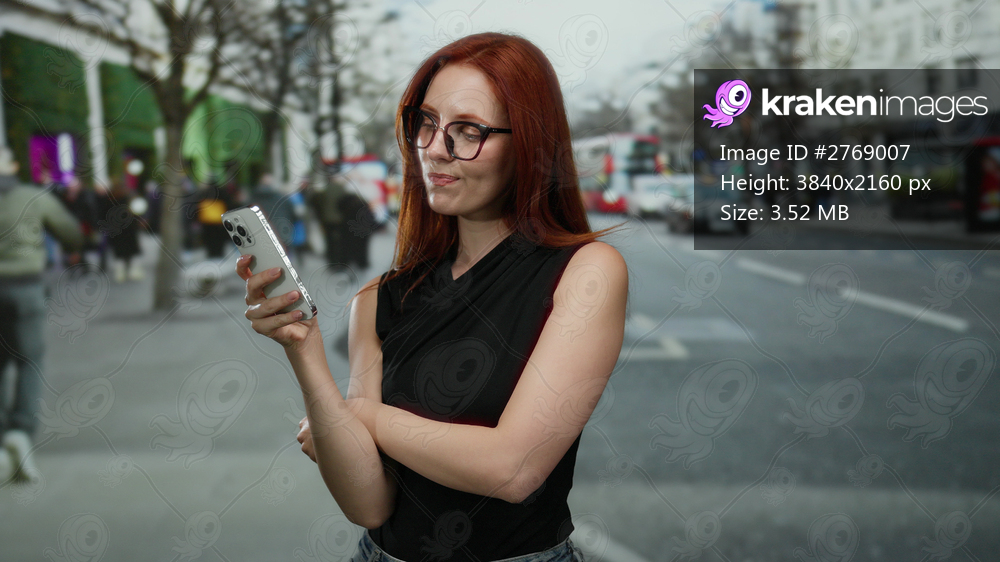 Woman using smartphone on bustling city street with red hair and glasses overlooking busy urban setting with buses and people.
