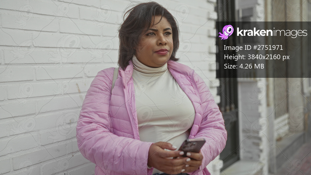 Woman using smartphone on city street outdoors wearing pink jacket and white shirt looking engaged with technology in an urban hispanic setting.