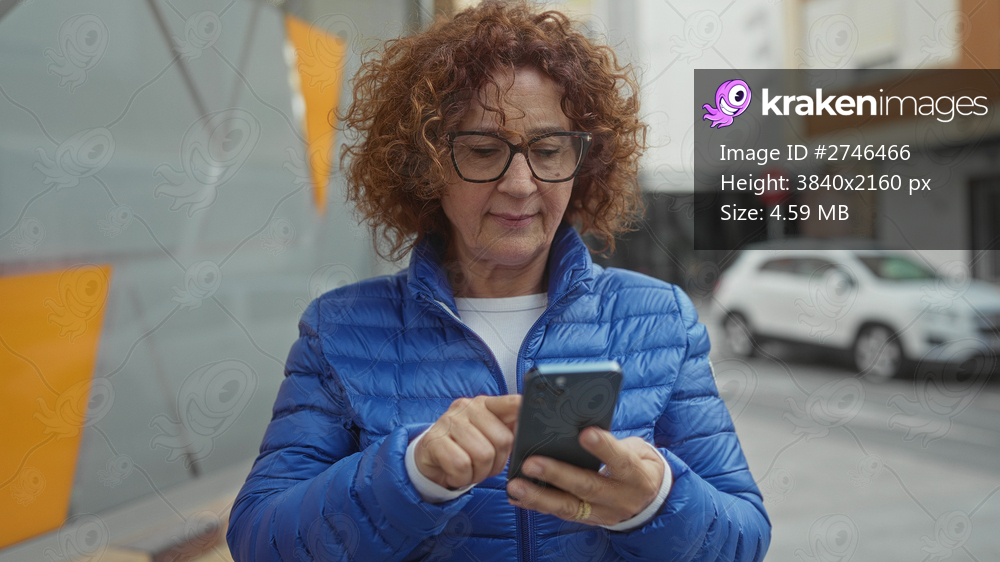 Woman using smartphone on urban street wearing glasses and blue jacket during daytime amidst city surroundings with parked vehicles in background suggesting casual activities outdoors - Kraken Images