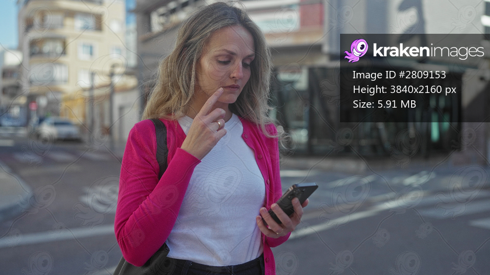 Woman using smartphone outside on urban street with thoughtful expression, wearing pink jacket and white shirt, in modern city setting, young professional appearance, contemporary lifestyle. - Kraken Images