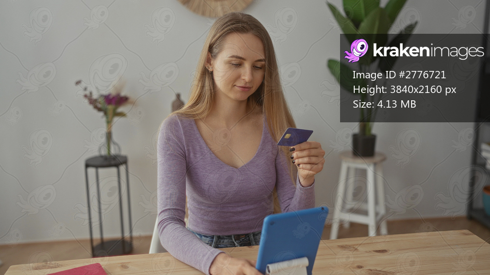 Woman using tablet for online shopping in modern living room with card in hand, surrounded by decor, emphasizing a quiet indoor atmosphere