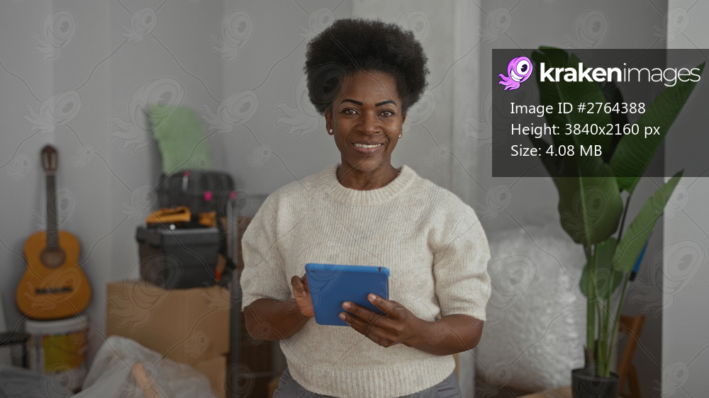 Woman using tablet in a cozy living room with plants and unpacked boxes suggests a recent move and new beginnings in a warm, inviting apartment setting. - Kraken Images