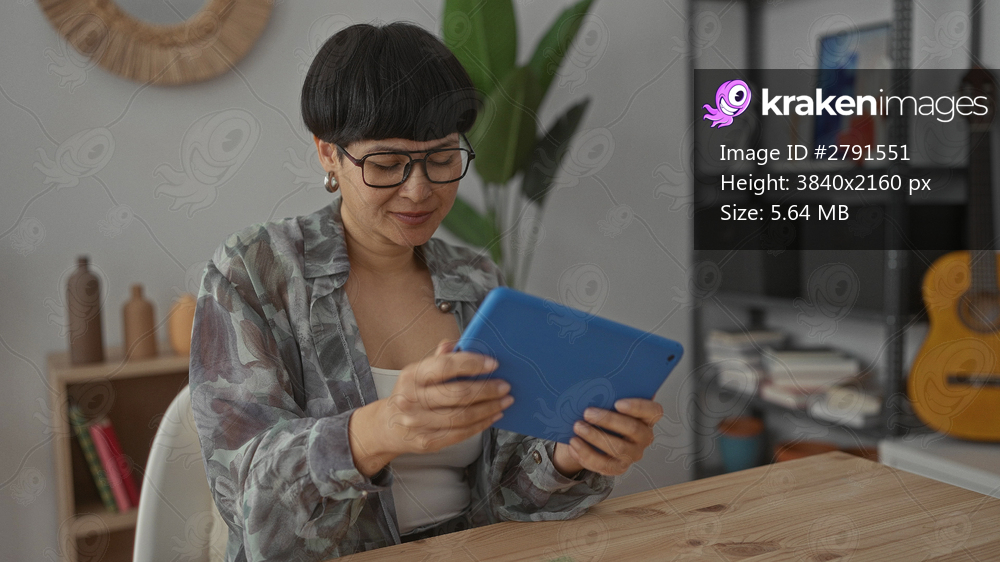 Woman using tablet in cozy living room with plants and wooden shelves, showcasing relaxation and modern technology in a home setting.