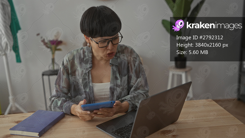 Woman using tablet in modern living room with laptop on table surrounded by books and plants