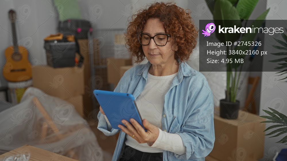 Woman using tablet in new apartment surrounded by moving boxes and plants, showcasing a thoughtful moment during relocation in an urban setting.