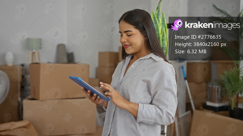 Woman using tablet in new home surrounded by cardboard boxes and plants, conveying the excitement of moving into a fresh living space.