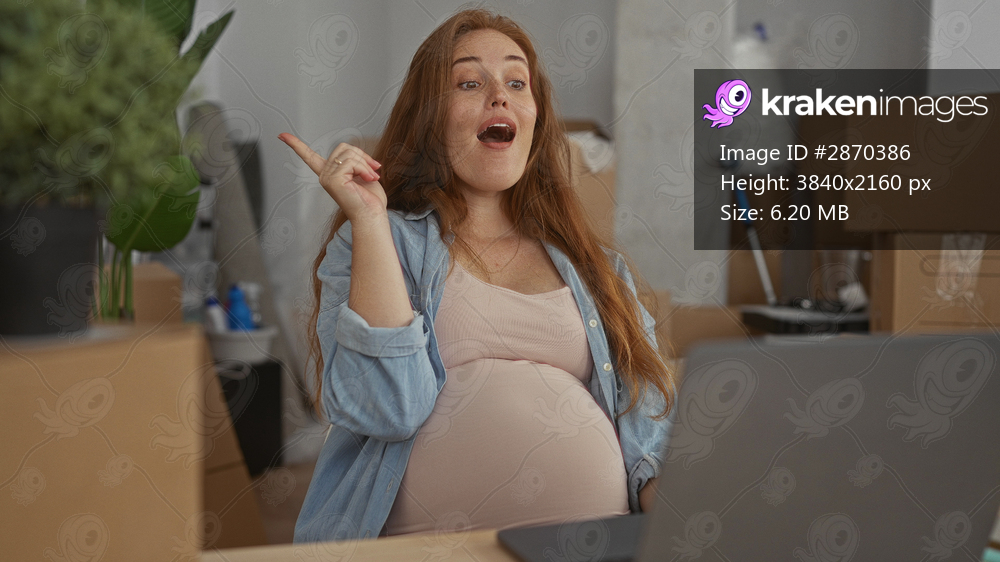 Woman with visible belly pointing head at laptop in building; anticipation planning motherhood hope.