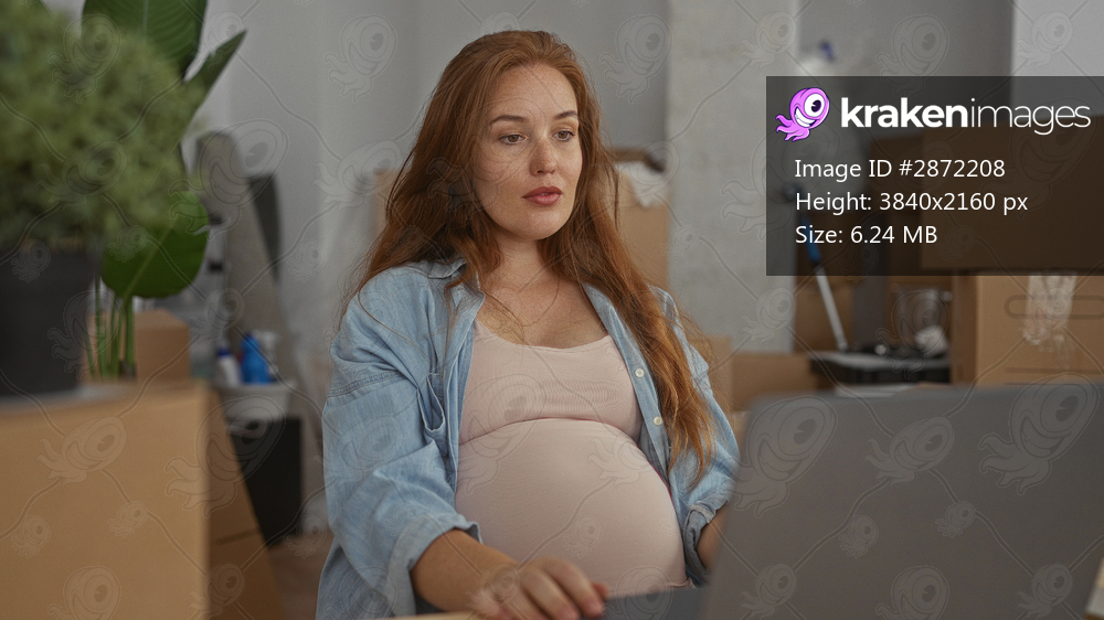 Woman with visible belly pointing head at laptop in building; anticipation planning motherhood hope.