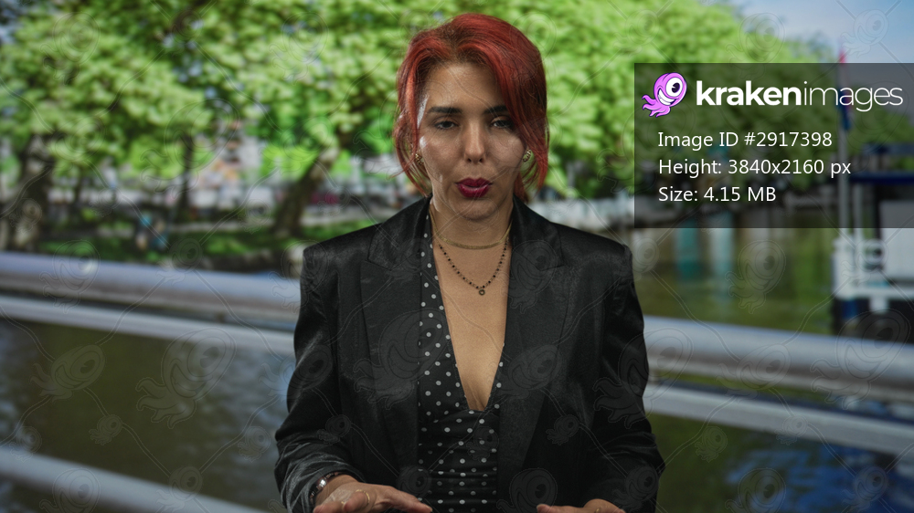 Woman with visible cleavage and hands raised palms up on street canal railing in amsterdam; serenity reflection.