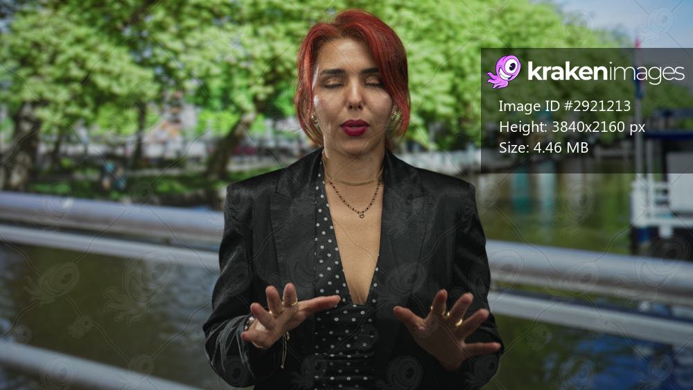 Woman with visible cleavage and hands raised palms up on street canal railing in amsterdam; serenity reflection.